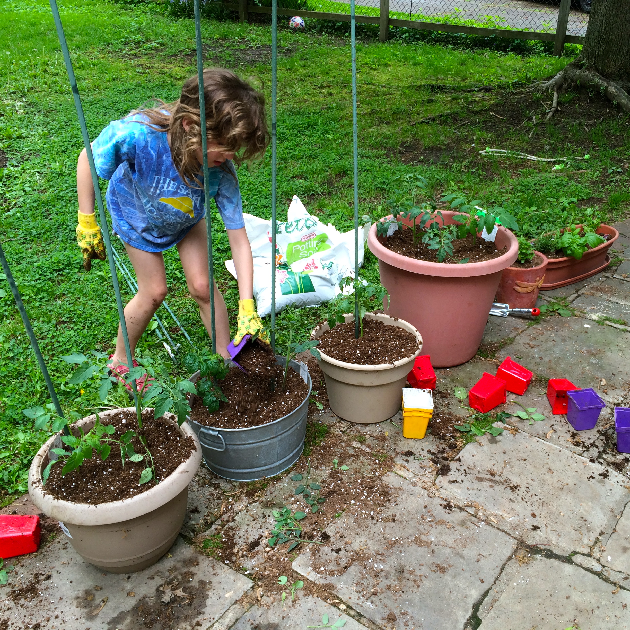 Once we got home she declared the planting her project. With just a little guidance from me she filled up all 6 pots with soil and plants. She might have more of a green thumb than I do!