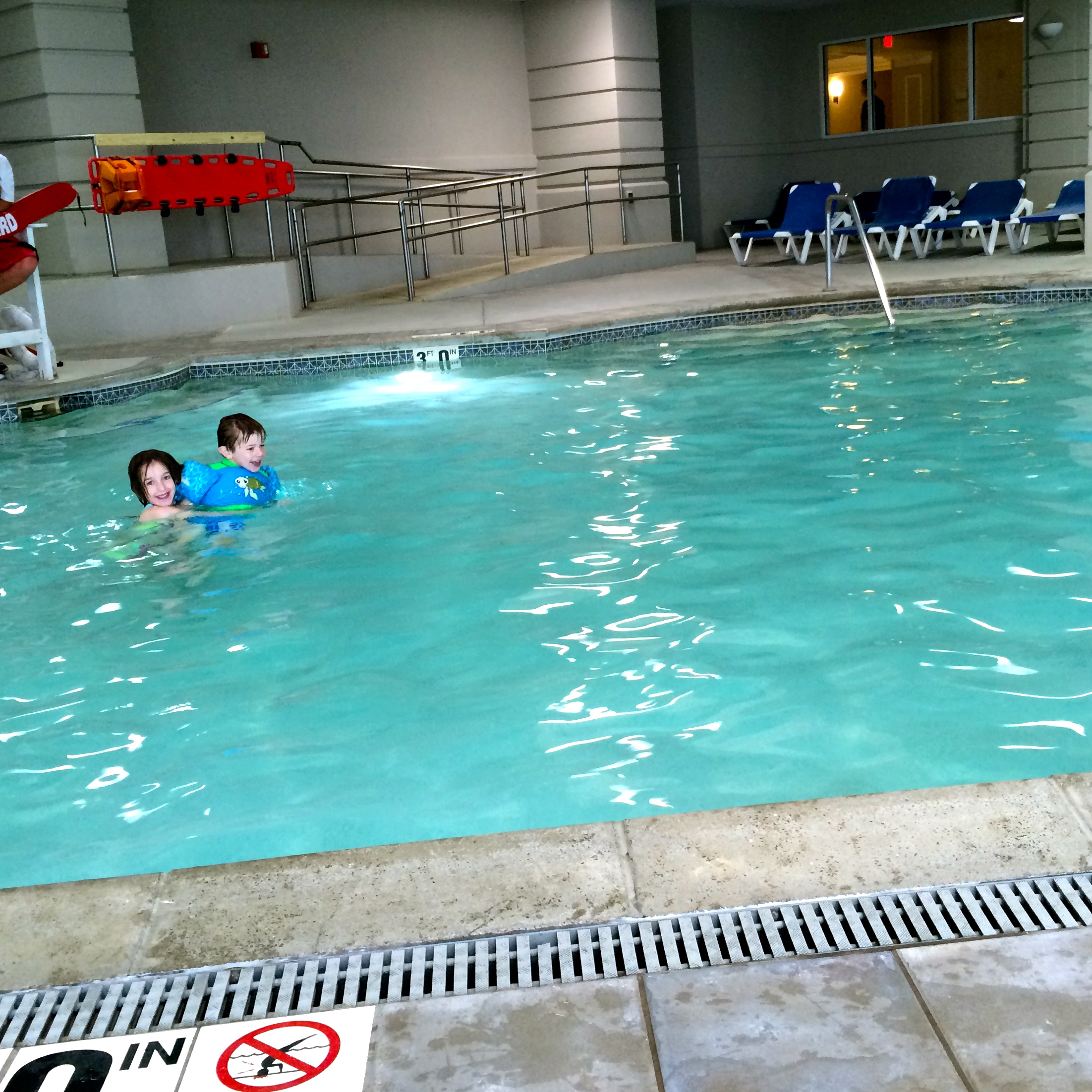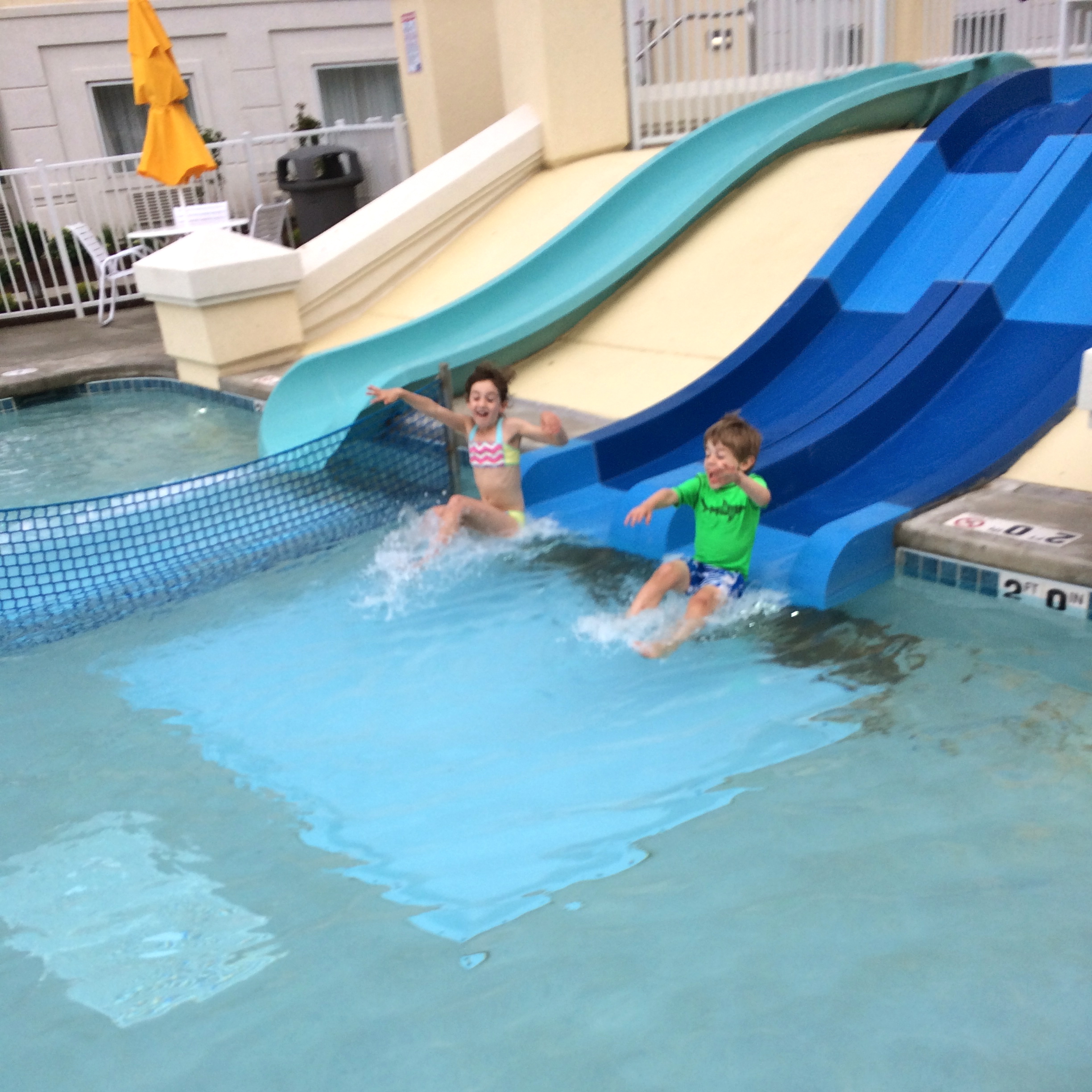 They each got 2 trips down the slide before the thunder started rumbling, sending us inside. This pool has 2 very alert guards and is enclosed by a fence. The opposite end is zero entry and has all kids of splash/spray stuff.